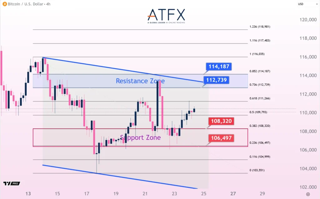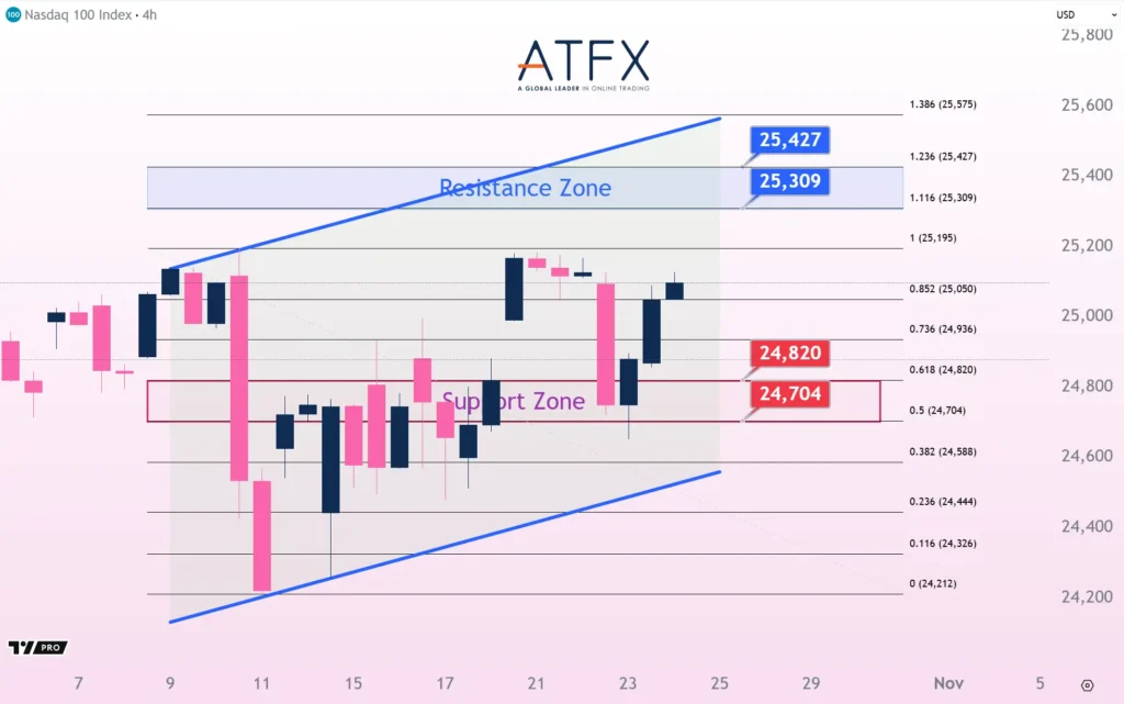 The NAS100 climbed 0.89% to 22,942, driven by tech rebound and strong quantum computing stocks, with Tesla up 2.3% despite earnings miss. Technically, the index is holding the uptrend line near 24,820, with upside momentum eyeing resistance at 25,309 if buyers sustain control.