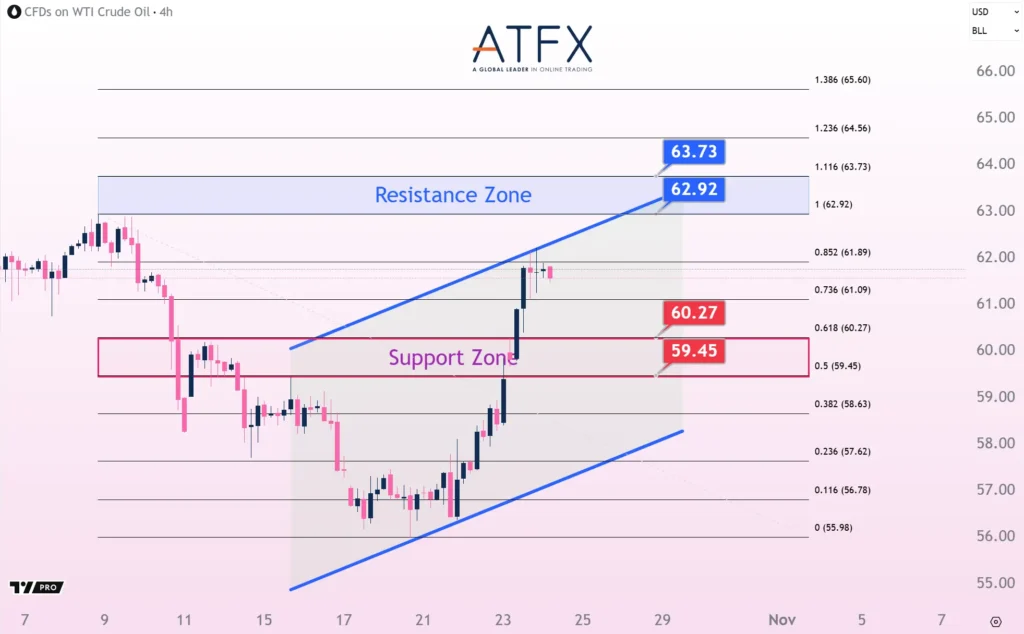 WTI surged nearly 6% to $61.79 after U.S. sanctions on Rosneft and Lukoil fueled supply fears. Technically, prices broke a major downtrend line and reclaimed $60.27 as a new support. Holding above this zone favors a push toward $62.92, though momentum may face short-term pullbacks.