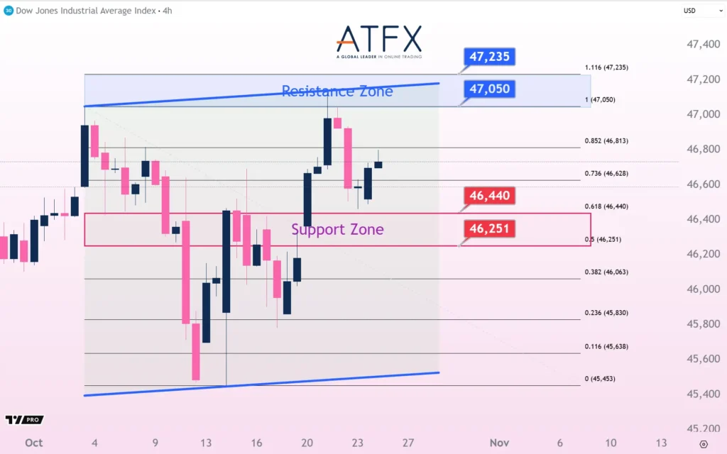 The Dow Futures gained 0.31% to 46,734, lifted by strong energy and aerospace shares as earnings season remains mixed but with 86% of S&P 500 firms beating estimates. Technically, price holds above 46,440 support, with momentum favoring a climb toward 47,050 if the ascending trendline sustains.