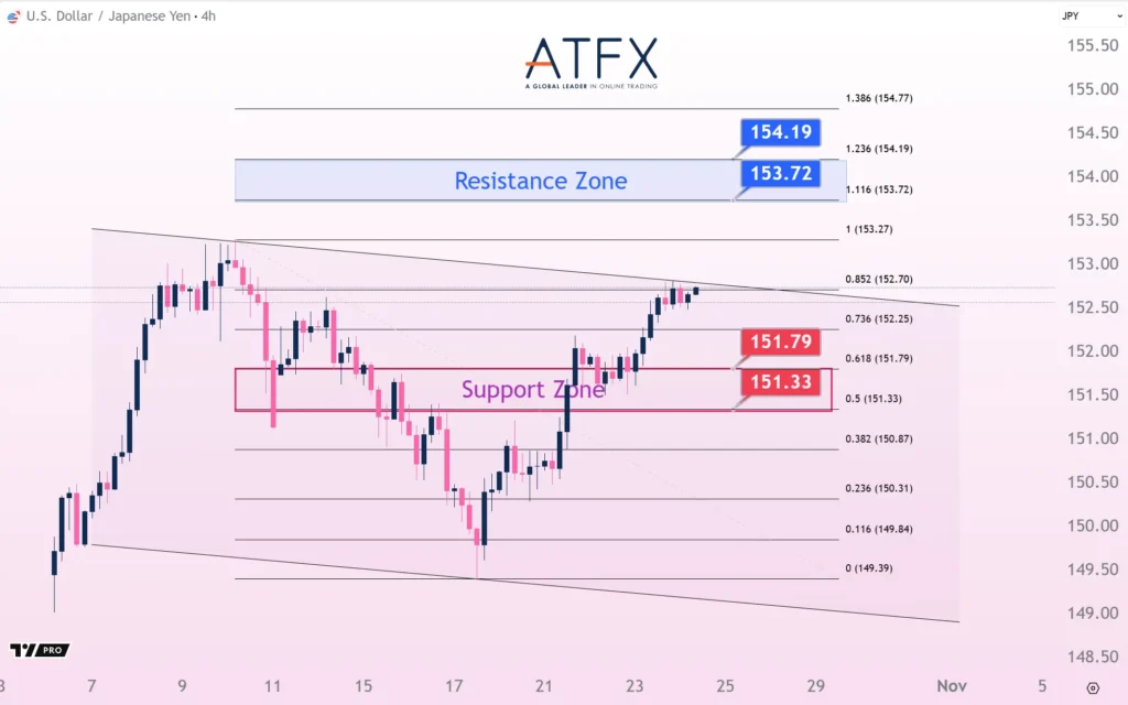 USD/JPY climbed to 152.52 (+0.38%) as oil surged on U.S. sanctions against Russian majors, keeping the yen under pressure near multi-month lows. Technically, holding above 151.80 favors further upside toward 153.70.