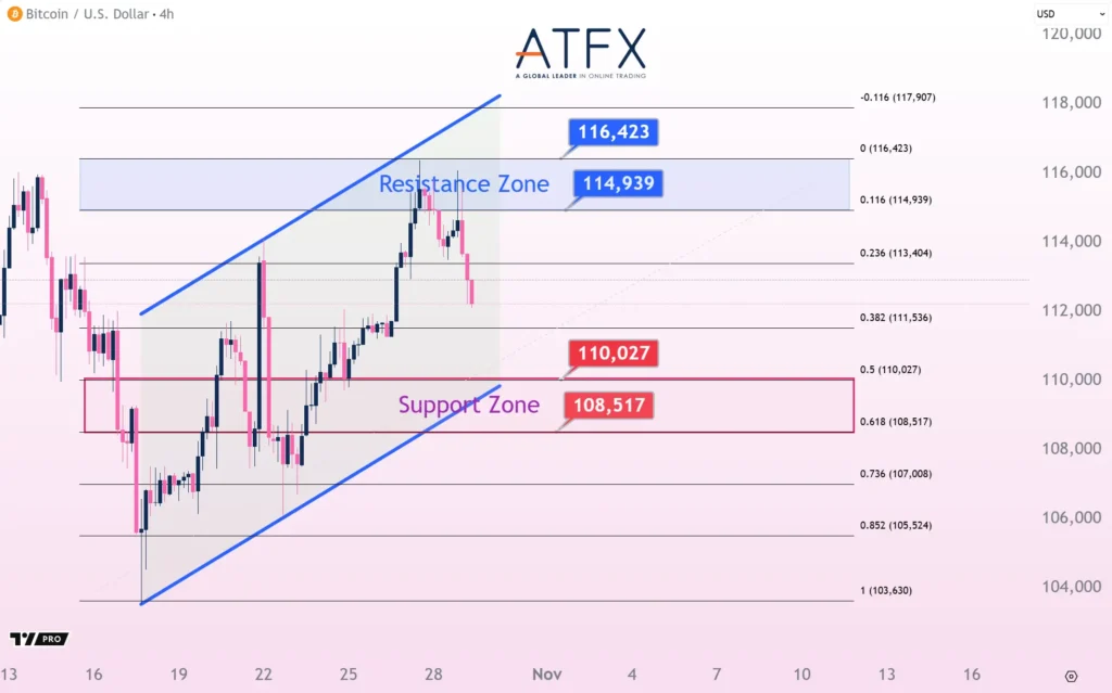 Bitcoin steadied near $115,700 after briefly topping $116k, with markets cautious ahead of the Fed’s rate decision and Trump–Xi talks. On charts, $110,027 serves as pivotal support; holding above could maintain bullish momentum, while a break lower risks deeper correction.