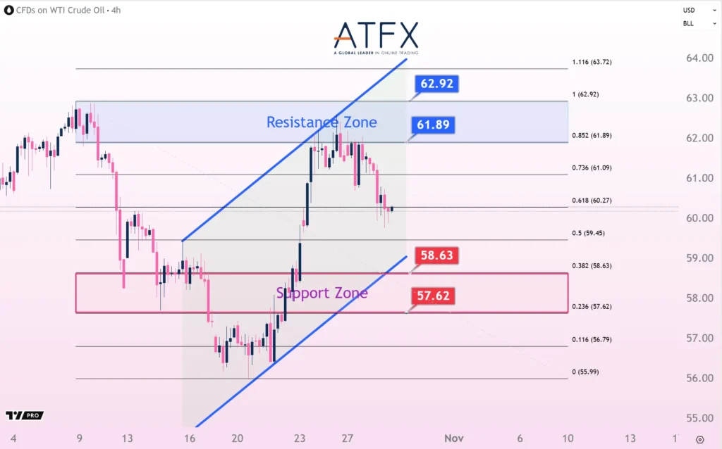 WTI crude extended its decline to $60.15, marking a third straight loss as traders balance U.S. sanctions on Russian oil firms against OPEC+’s potential December hike. Momentum indicators suggest sellers remain in control, with bears eyeing a possible retest of the $58.63 zone if recovery attempts falter.