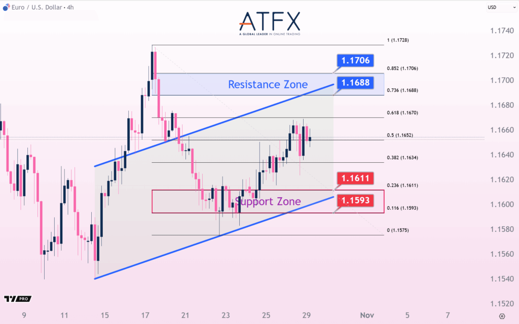 EUR/USD climbed to 1.1659 after softer U.S. consumer confidence data pressured the dollar. Markets widely expect the Fed to cut 25 bps, while the ECB is likely to hold steady this week. Technically, the pair is supported above 1.1611 ascending trendline, with potential upside toward 1.1688 if momentum holds.