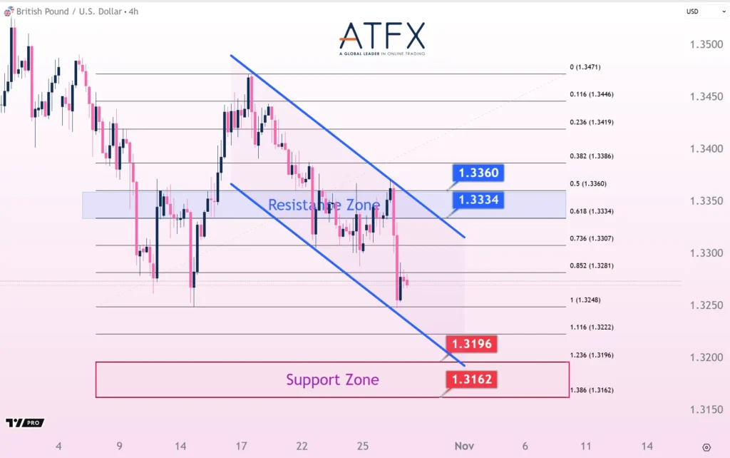 GBP/USD slid to 1.3280, its lowest since August, after the OBR flagged a £20B fiscal hit from weaker productivity. From a technical view, the pair remains capped by a descending trendline, with resistance near 1.3334 and downside risk toward 1.3196 if selling pressure extends. Policy divergence between the Fed and BoE may cushion losses.