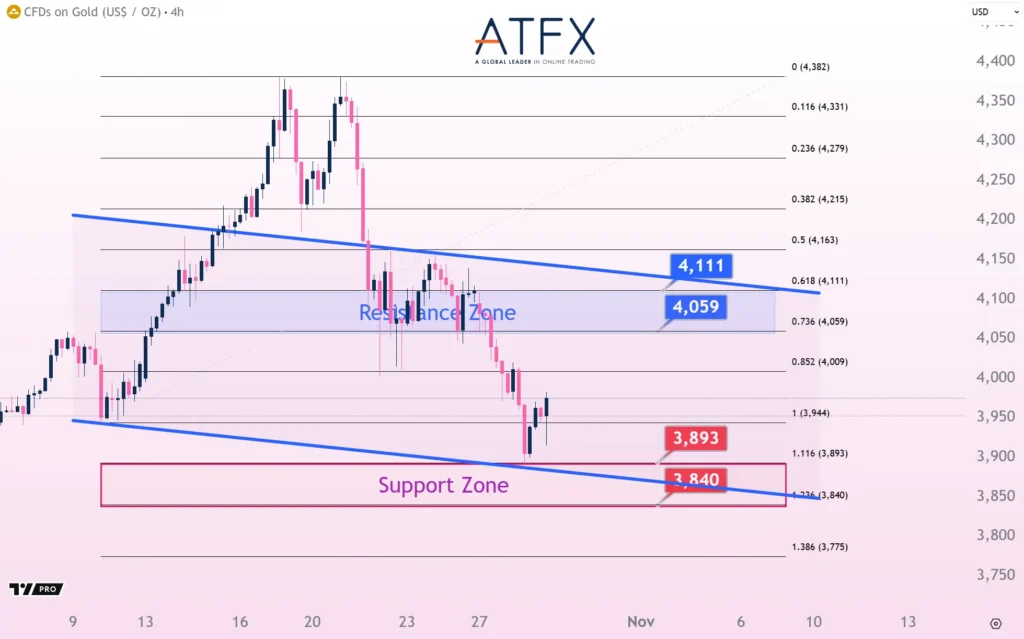 The NAS100 rose 0.8% to 23,827, powered by tech strength. Microsoft gained 2% on a larger OpenAI stake, while Apple briefly crossed the $4T valuation mark. Technically, support lies at 25,805, with momentum favoring a push toward 26,182 resistance if buyers sustain control.