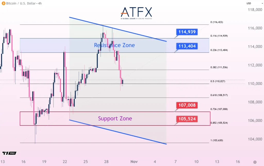 Bitcoin eased to around $111.9k, with markets cautious after the Fed meeting. The 4H chart shows price capped by a descending trendline, while $110k remains key support. A break below could accelerate downside toward $107,008, whereas reclaiming $113,404 would signal renewed bullish momentum.