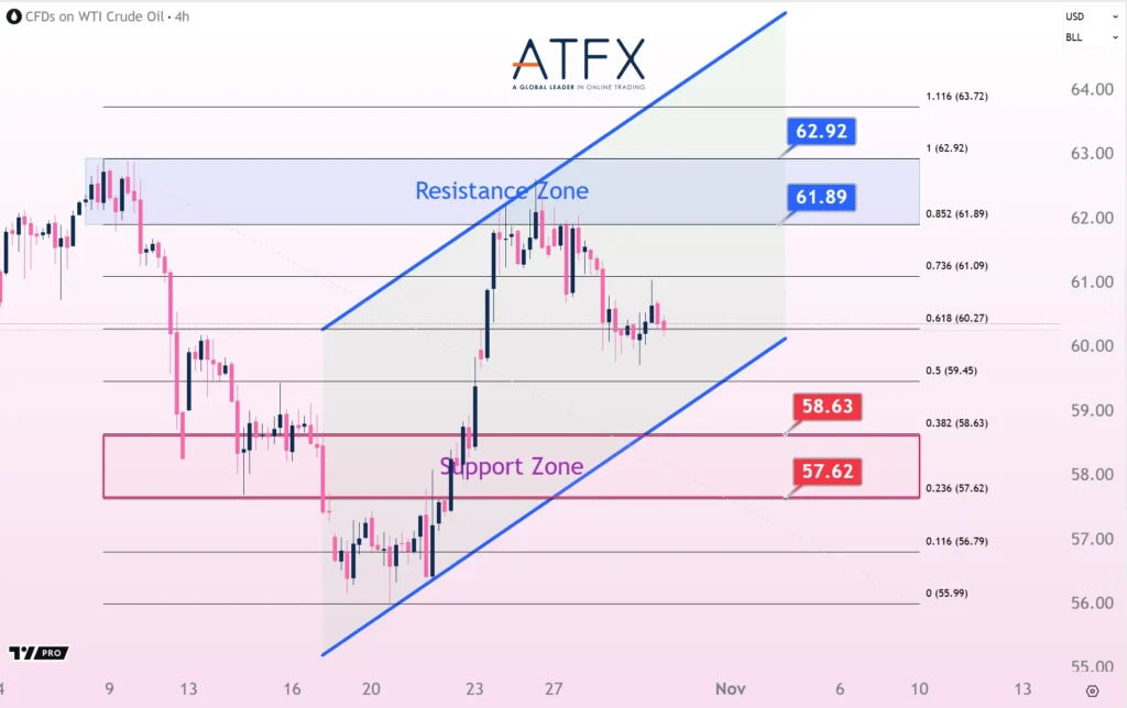 WTI crude rose 0.6% to $60.48 after U.S. stockpiles fell more than expected. Price action is consolidating around $60, with $58.63 serving as a key floor. A break above $61.89 could fuel further upside, while failure to hold $57.62 risks a deeper retracement.