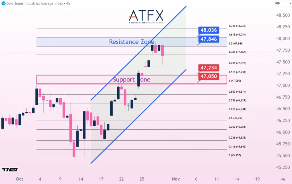 The Dow Future eased 0.16% to 47,632 after Powell’s hawkish tone weighed on sentiment. Support lies at 47,234, while resistance is capped near 47,846. A bounce from support could retest highs, but failure to hold risks a deeper pullback.