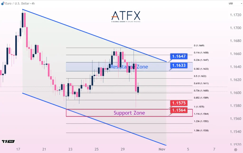 EUR/USD slipped to 1.1585 (-0.56%) as Powell’s hawkish tone lifted the dollar. Price action remains capped by the descending trendline, with short-term rebounds struggling near 1.1633. If momentum fades, a retest of 1.1575–1.1564 is likely, and a sustained break could expose the mid-1.15 zone.
