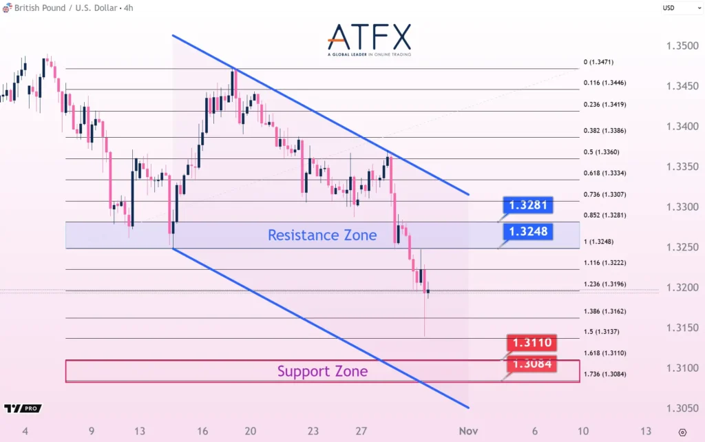 GBP/USD slumped 0.9% to 1.3151, its lowest in over five months, as BoE rate-cut bets weighed on sentiment. On the charts, price remains capped by a firm descending trendline, with sellers defending the 1.3248 area. A failure to reclaim this level could see momentum drag the pair toward 1.3100, while only a decisive recovery above 1.3281 would ease bearish pressure.