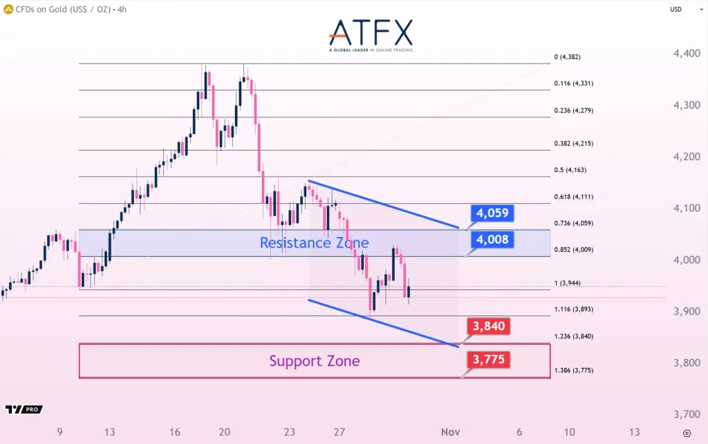 Gold pared gains, closing at $3,964/oz (+0.3%) as Powell’s remarks dampened December cut bets. Resistance remains at $4,008, while $3,920 offers immediate support. A break lower could expose $3,840, but sustained recovery above $4,008 would ease downside risks.