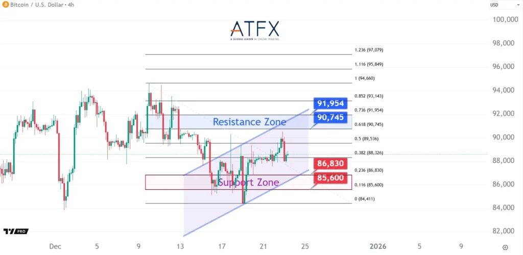 Bitcoin edged higher toward the $90,000 level as expectations for Fed rate cuts in 2026 supported broader risk sentiment. However, slowing ETF inflows and thin year-end liquidity continue to cap upside momentum. Price action remains range-bound, with $90,000 acting as a key psychological ceiling.