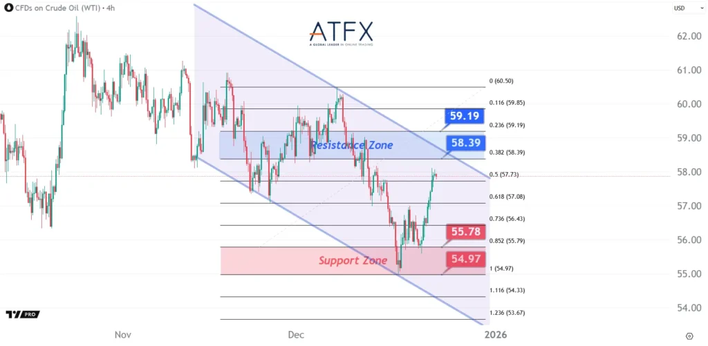 Oil prices rebounded on heightened geopolitical risks and supply disruption concerns. Crude bounced from the 54.97–55.78 support zone but remains capped below 58.39–59.19. The broader trend stays bearish, with short-term price action driven mainly by geopolitical headlines.