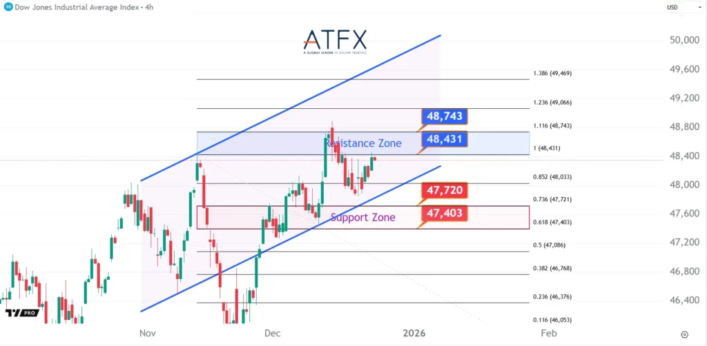 Cooling inflation has reinforced expectations for Fed rate cuts, supporting risk sentiment ahead of the holidays. The Dow Futures stabilized above the 47,403–47,720 support zone and is now testing resistance at 48,431–48,743. Without a clear breakout, near-term consolidation is likely.