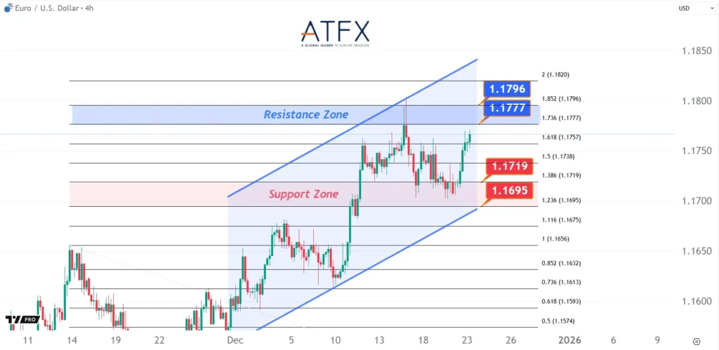 EUR/USD remains supported by broad USD weakness driven by 2026 Fed cut expectations. Price rebounded from the 1.1695–1.1719 support zone and continues to trade within an ascending channel. Upside momentum may slow near the 1.1777–1.1796 resistance band, keeping the pair range-bound with a mild bullish bias.