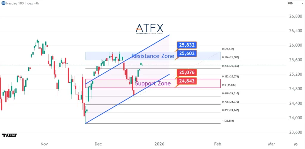 The NAS100 remains driven by strength in AI and semiconductor stocks, benefiting from easing rate expectations. The index rebounded from the 24,843–25,076 support zone and is now retesting resistance at 25,602–25,832. A pause may occur if resistance holds, but the broader uptrend remains intact.