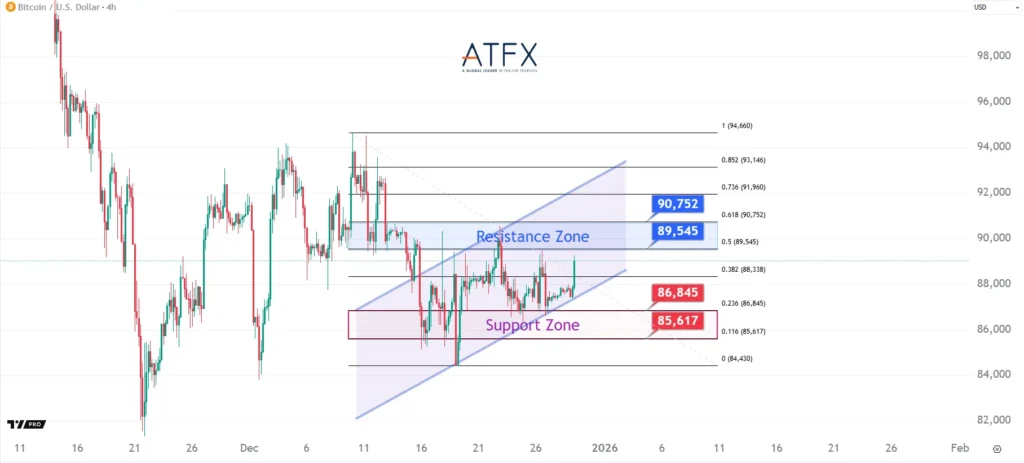 Bitcoin needs a roughly 6.24% rally to finish 2025 in positive territory, or it risks closing the first post-halving year in the red. Technically, BTC remains capped by the 89,545–90,743 resistance zone, while 85,595–86,826 acts as near-term support, keeping price action range-bound amid fading Fed easing expectations.