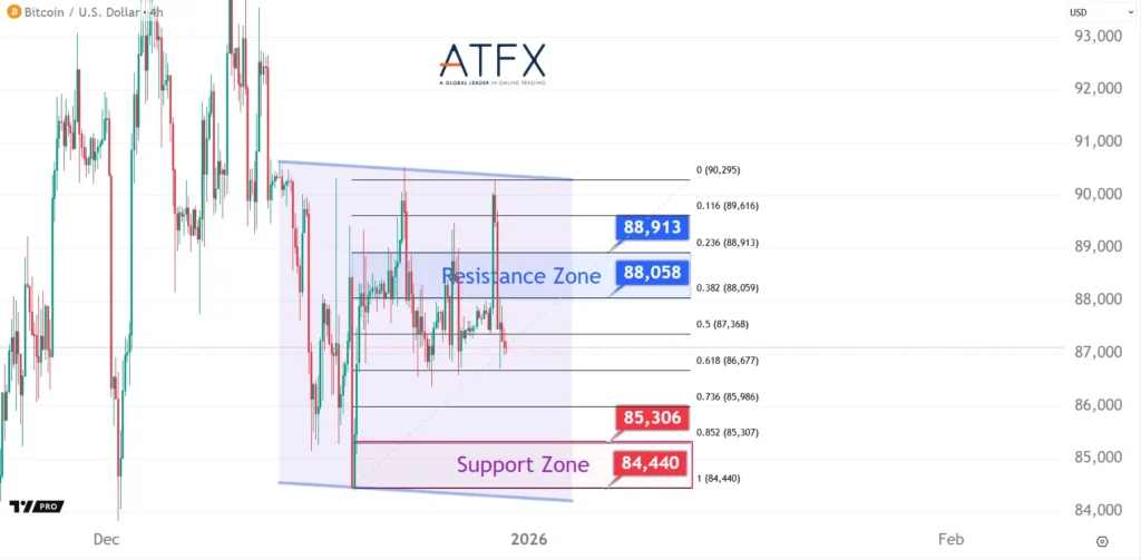 Bitcoin trades in a $87,000–$90,000 range as year-end profit-taking and weaker risk sentiment cap upside, with bulls failing to hold above $90,000. Fed rate-cut expectations remain a medium-term support, but short-term momentum is pressured by equity volatility and thinner liquidity. Technically, watch $88,058 resistance and $85,306 support, suggesting continued consolidation.