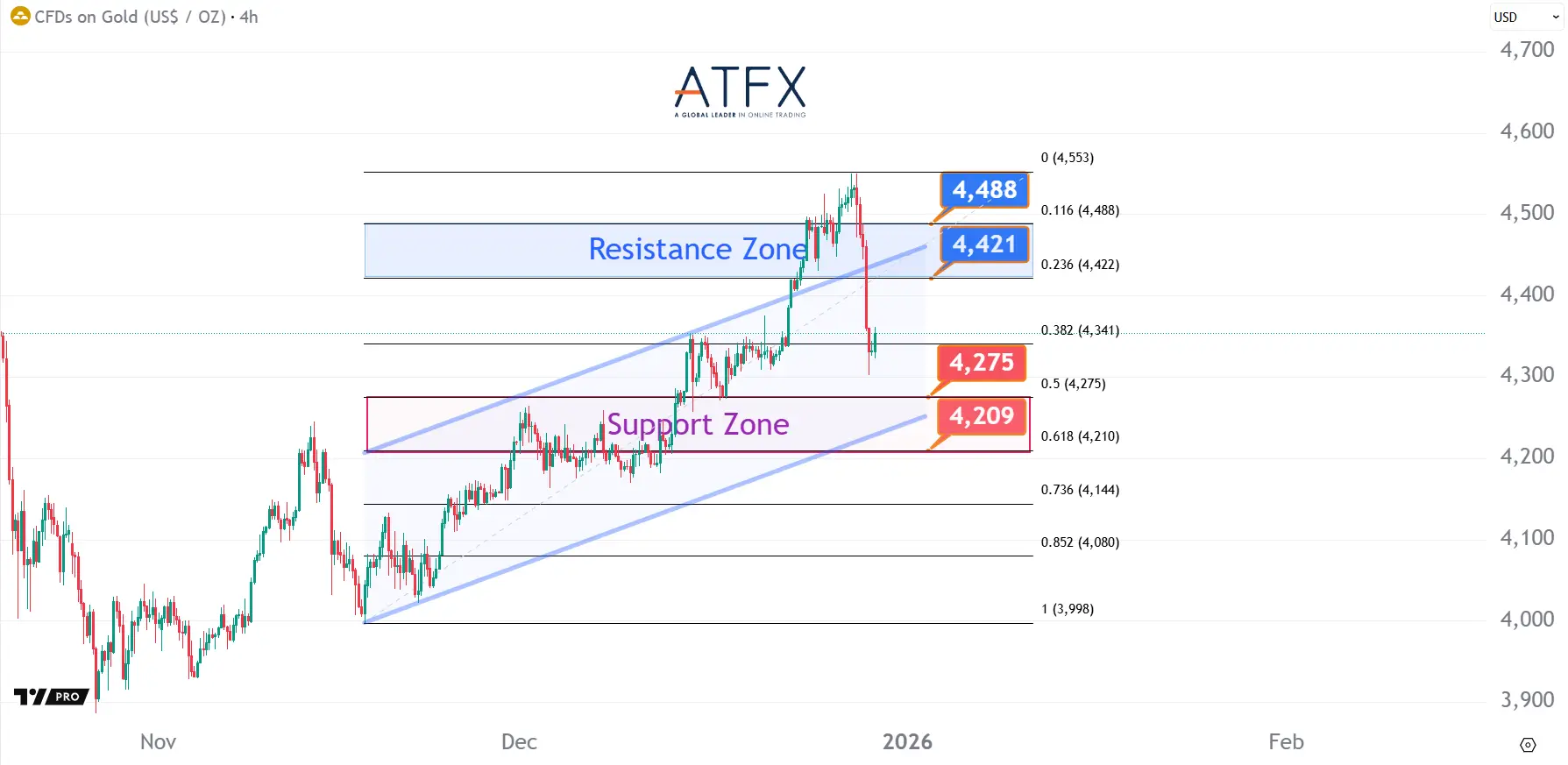 Gold retreated sharply after failing to hold record highs, with year-end profit-taking and thin liquidity amplifying the pullback, while geopolitical risks continue to limit downside. From a technical perspective, price slipped back into a prior congestion area, with focus now shifting to whether buying interest can stabilize the move around the 4,275–4,209 zone.