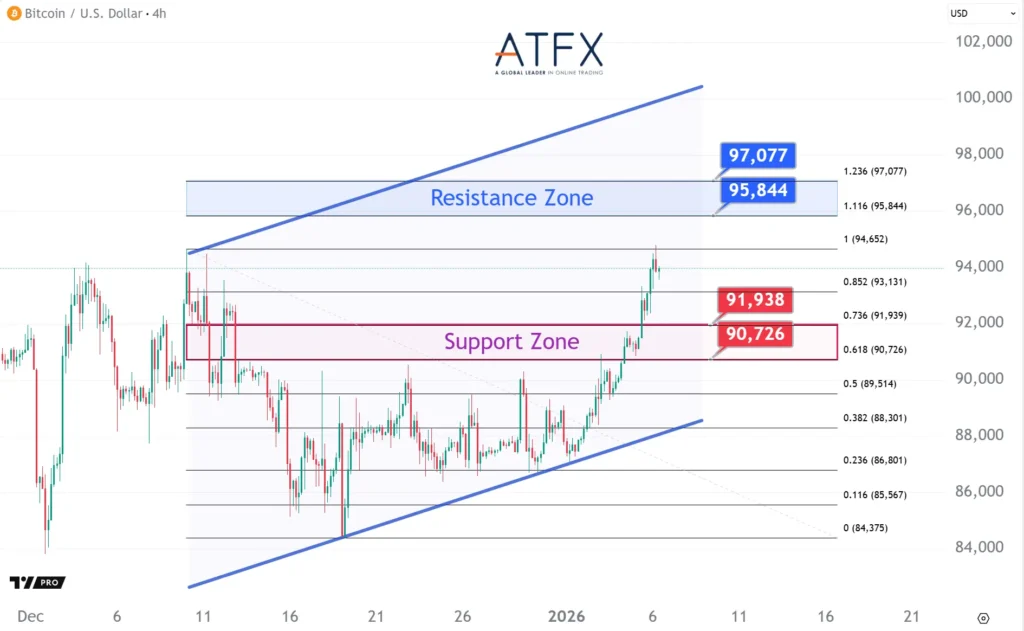 Bitcoin rebounded above $93,000, supported by improving risk appetite and tech-sector strength. Selling pressure is emerging near the $95,844–$97,077 zone, limiting follow-through. As long as $90,276–$91,938 holds, BTC favors consolidation over a clear breakout.