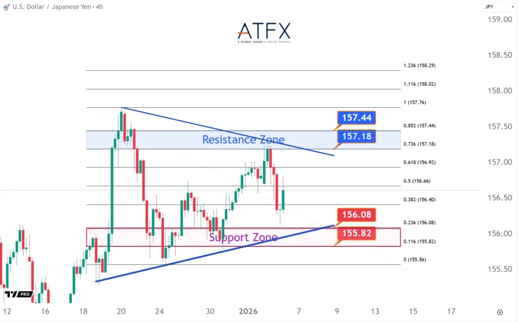 USD/JPY pulled back as dollar momentum faded and the BoJ reaffirmed its tightening bias, with policy divergence rather than geopolitics driving yen demand. Repeated rejection near 157.18–157.44 highlights lingering upside pressure, while the 156.08–155.82 zone remains pivotal. Holding this area would favor consolidation over a sharper downside move.