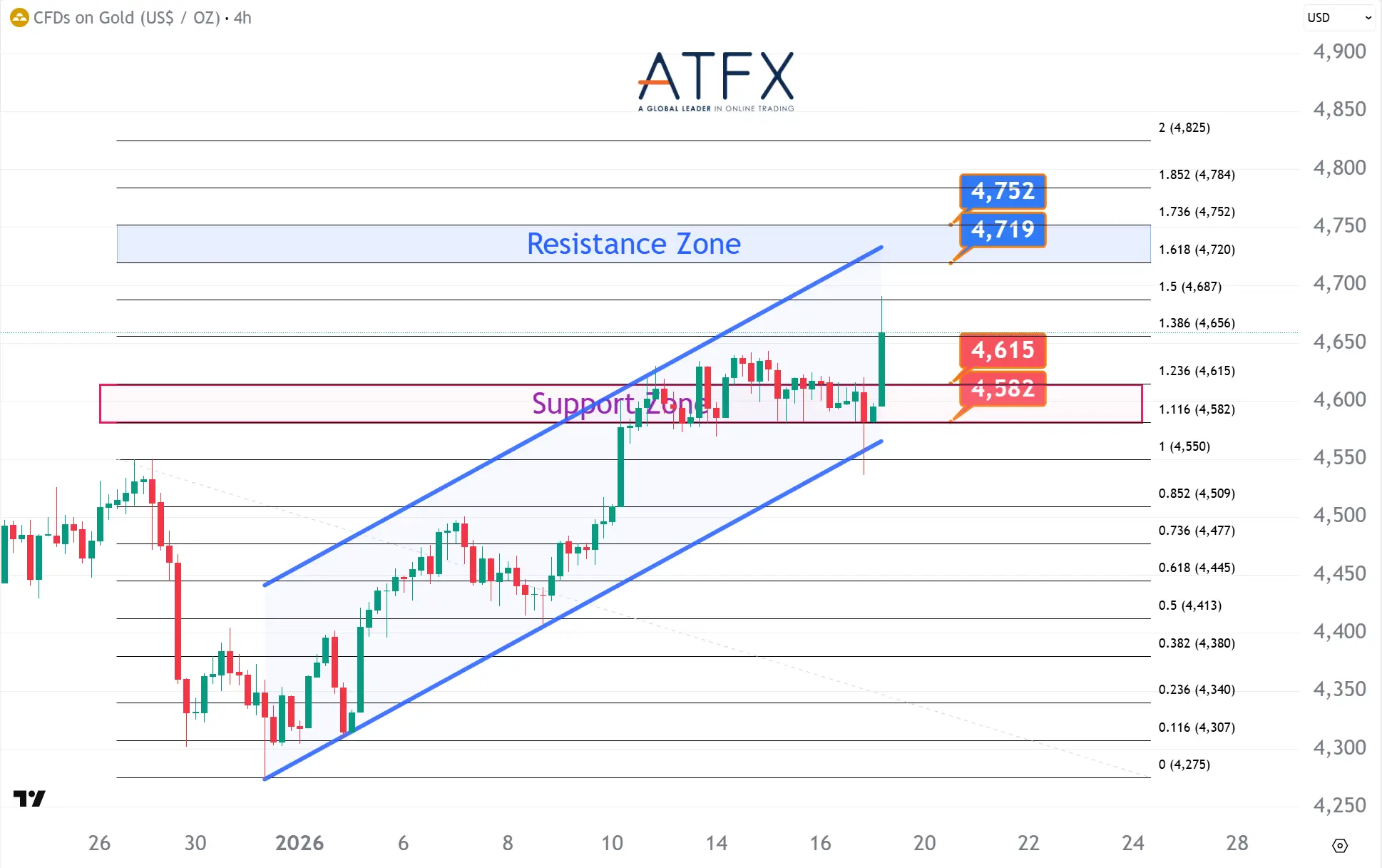 Spot gold consolidates after printing fresh record highs, with safe-haven flows sustained by trade and geopolitical risks. Technically, prices remain supported within an ascending channel, rebounding from the $4,615–$4,582 support zone. A break above the $4,719–$4,752 resistance could open room for further upside.