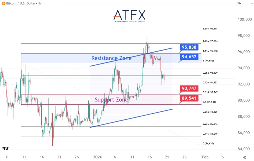 Bitcoin slips towards $92,500 as Trump’s Greenland-related tariff threats fuel broad risk-off sentiment. Capital rotation into traditional safe havens, alongside delays to a U.S. crypto regulatory bill, continues to cap crypto demand. Technically, BTC is capped by the $94,652–95,838 resistance zone, with $90,747–89,541 acting as key near-term support.