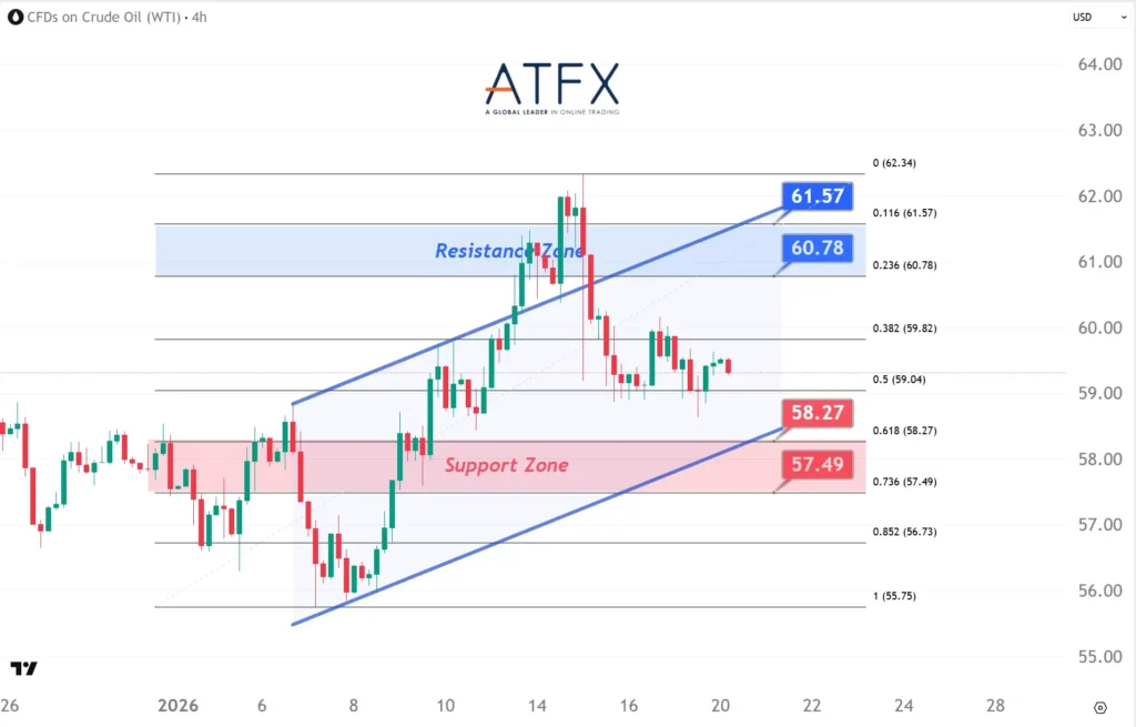 WTI trades around $59.36 as easing unrest in Iran reduces near-term supply risks. Attention has shifted to potential demand headwinds from rising US–EU trade tensions, keeping upside capped. Technically, prices remain constrained below $60.78–$61.57 resistance, with $58.27–$57.49 support key on the downside.