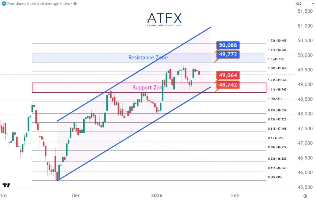 The Dow Futures softened as renewed trade-war rhetoric and Greenland-related tensions weighed on risk sentiment. Political uncertainty and holiday-thinned liquidity kept momentum muted. Technically, the index is consolidating within an ascending channel, with 49,772–50,088 resistance capping gains and 49,064–48,742 support acting as the near-term floor.