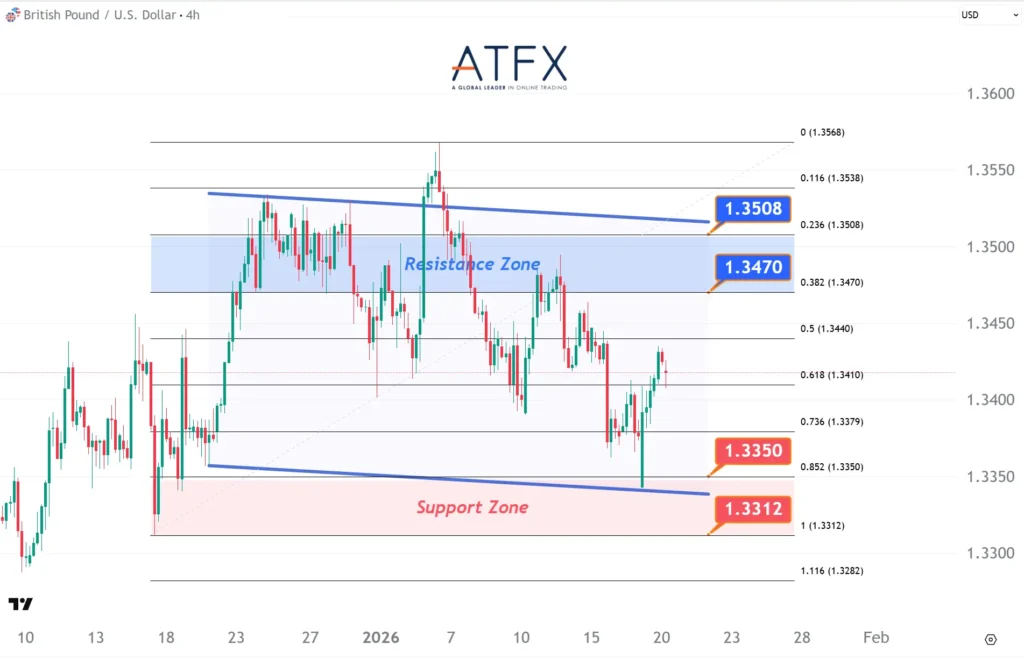 GBP/USD rebounds towards 1.3420, supported by broad USD weakness and improved sentiment after the UK opposed a trade war. Technically, price remains capped by the descending trendline and the 1.3470–1.3508 resistance zone, keeping the move corrective. Failure to break higher leaves 1.3350–1.3312 support in focus.