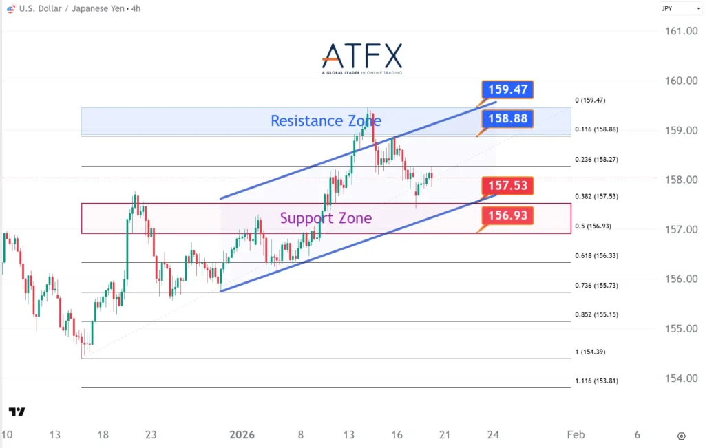 USD/JPY slips towards 157.9 as rising trade and geopolitical tensions boost yen safe-haven demand. Technically, the pair pulled back after failing to break through the 158.88–159.47 resistance zone and is now testing trendline support. A break below 157.53–156.93 could deepen the near-term correction.
