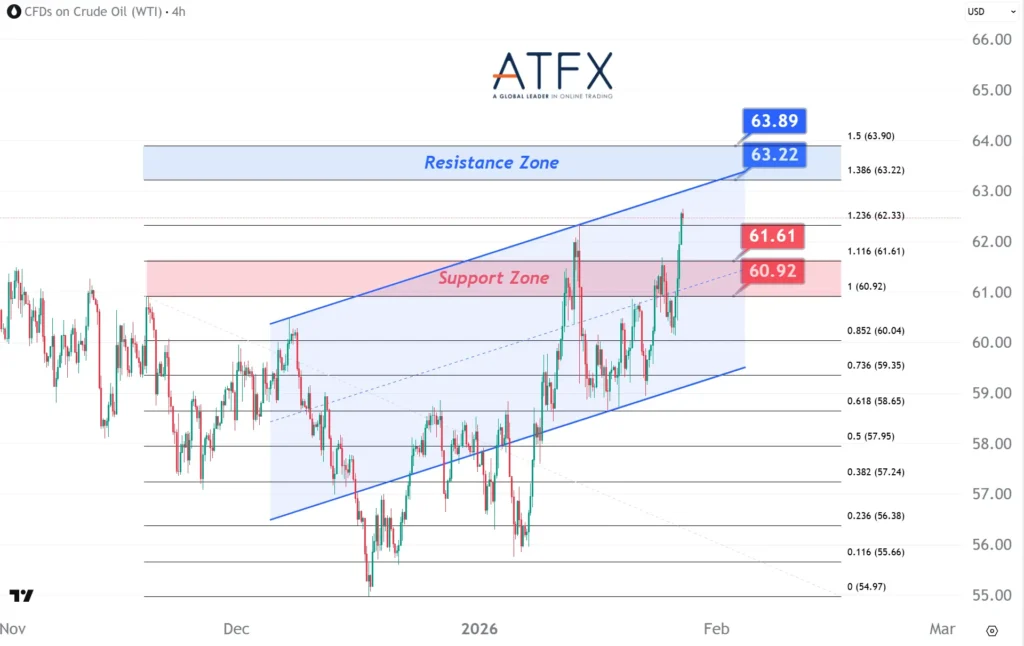 Oil prices surged on Tuesday as producers reeled from a winter storm that hobbled crude production and pushed US Gulf Coast crude exports to zero over the weekend. Prices have reached their highest level since October last year and are now stabilising above $62, as the market awaits the Federal Reserve’s decision. Optimistic comments could provide further support for oil prices.