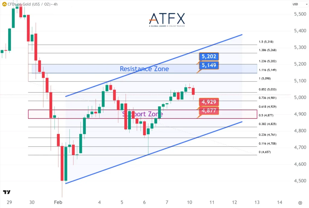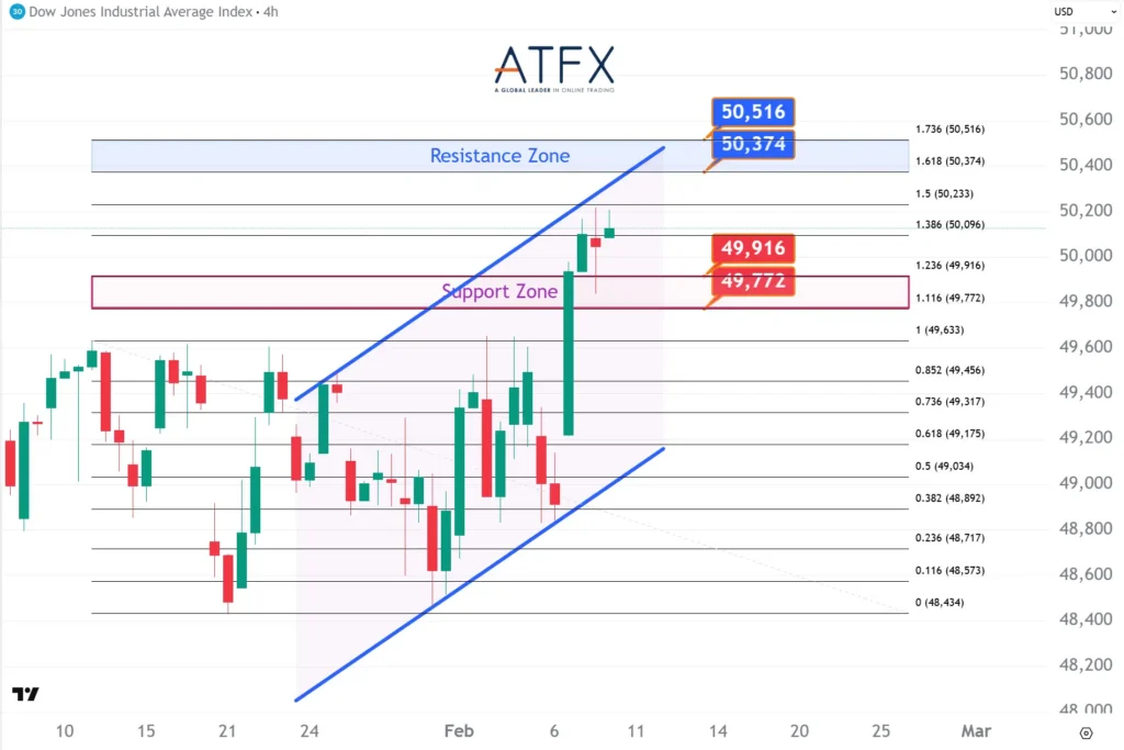 The Dow Futures notched a second consecutive record close as tech shares rebounded and earnings remained supportive. Price is holding above the 49,772–49,916 support area, with upside probing towards the 50,374–50,516 resistance zone. Attention now turns to U.S. jobs and inflation data, which will determine whether momentum can extend at elevated levels.