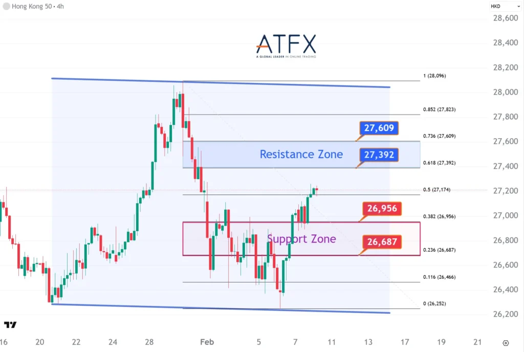 The NAS100 extended its rebound, led by software and mega-cap tech stocks, though heavy AI capex and stretched valuations continue to cap risk appetite. The index bounced from the 24,867–25,044 support zone, with upside now testing the 25,584–25,807 resistance area. Failure to clear this zone may keep the price range-bound.