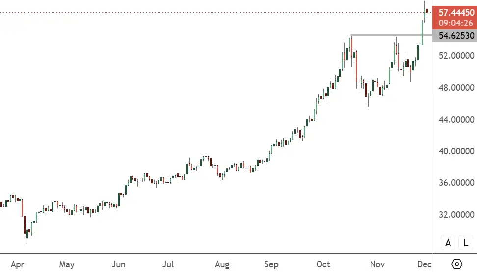 The price of XAGUSD has surged to new highs at 57.44, creating a support base at 54.62.