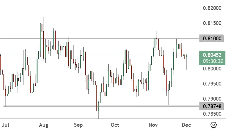 The USD v CHF pair has resistance at the 0.8100 level, and that creates a range down to the 0.7848 price level.