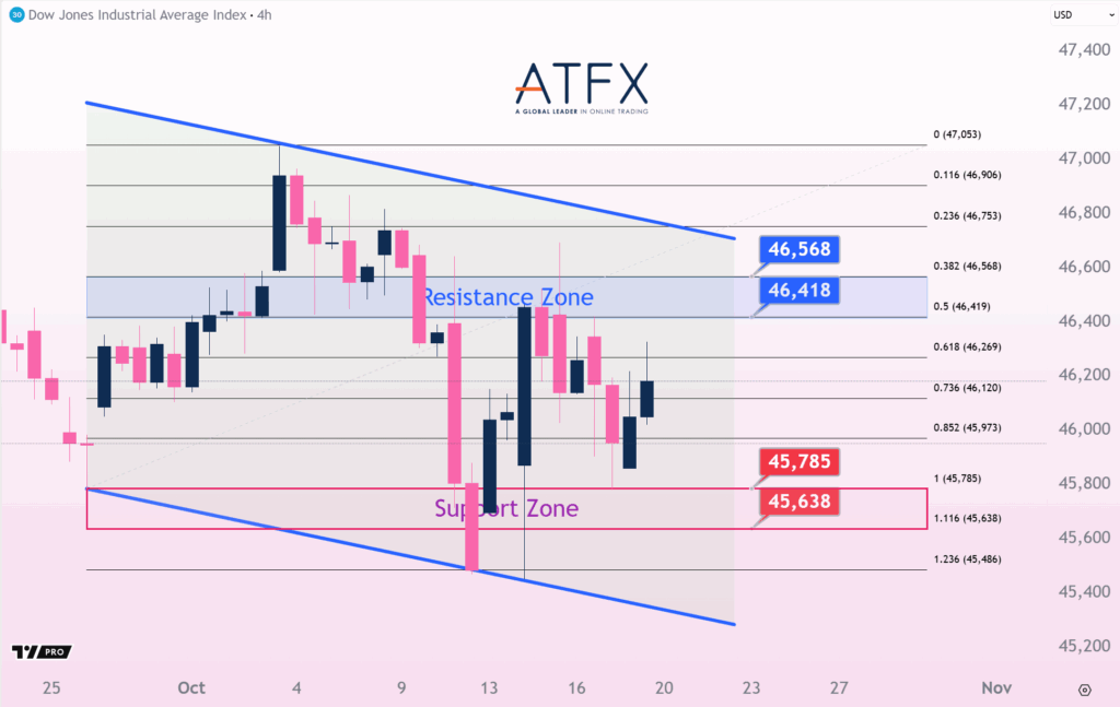 上周五美股市场暂时摆脱了周四引发地区银行股大幅抛售的信贷担忧,美国总统与财长关于国际贸易局势的最新讲话安抚了市场情绪。道指止步两连跌,但是尾盘停留在日图均线交汇的关键阻力下方,所以要寻求连续反弹,突破均线阻力至46300上方为关键。