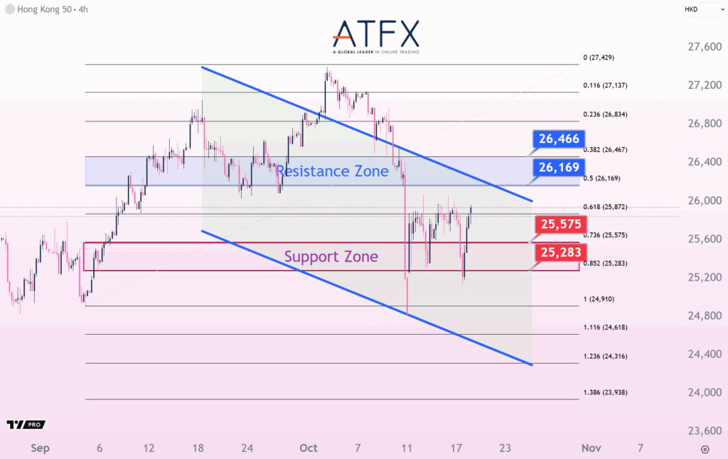 上周五的港股持续弱势,全日收挫641点,全周累计挫1043点跌穿25300价位,不过今早跟随特朗普最新言论带来的紧张情绪缓和而得到部分提振。HK50指数上周五探底回升,高低波动超过700点后最终将失地收复,所以当前多头可能继续发力尝试10日均线的突破收复26000关口。