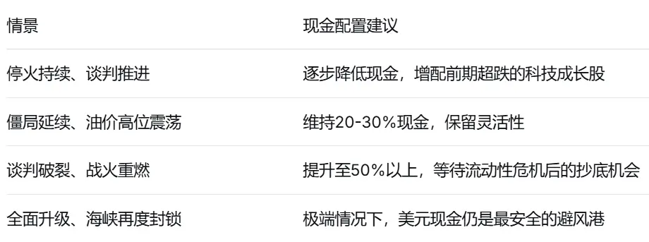 有利因素:两周停火是战术性喘息而非战略破冰。美伊之间的关键分歧未解,在机构看来,高度不确定的环境中保持仓位灵活性——现金是应对突发状况的缓冲垫,也是在机会出现时果断出手的弹药。